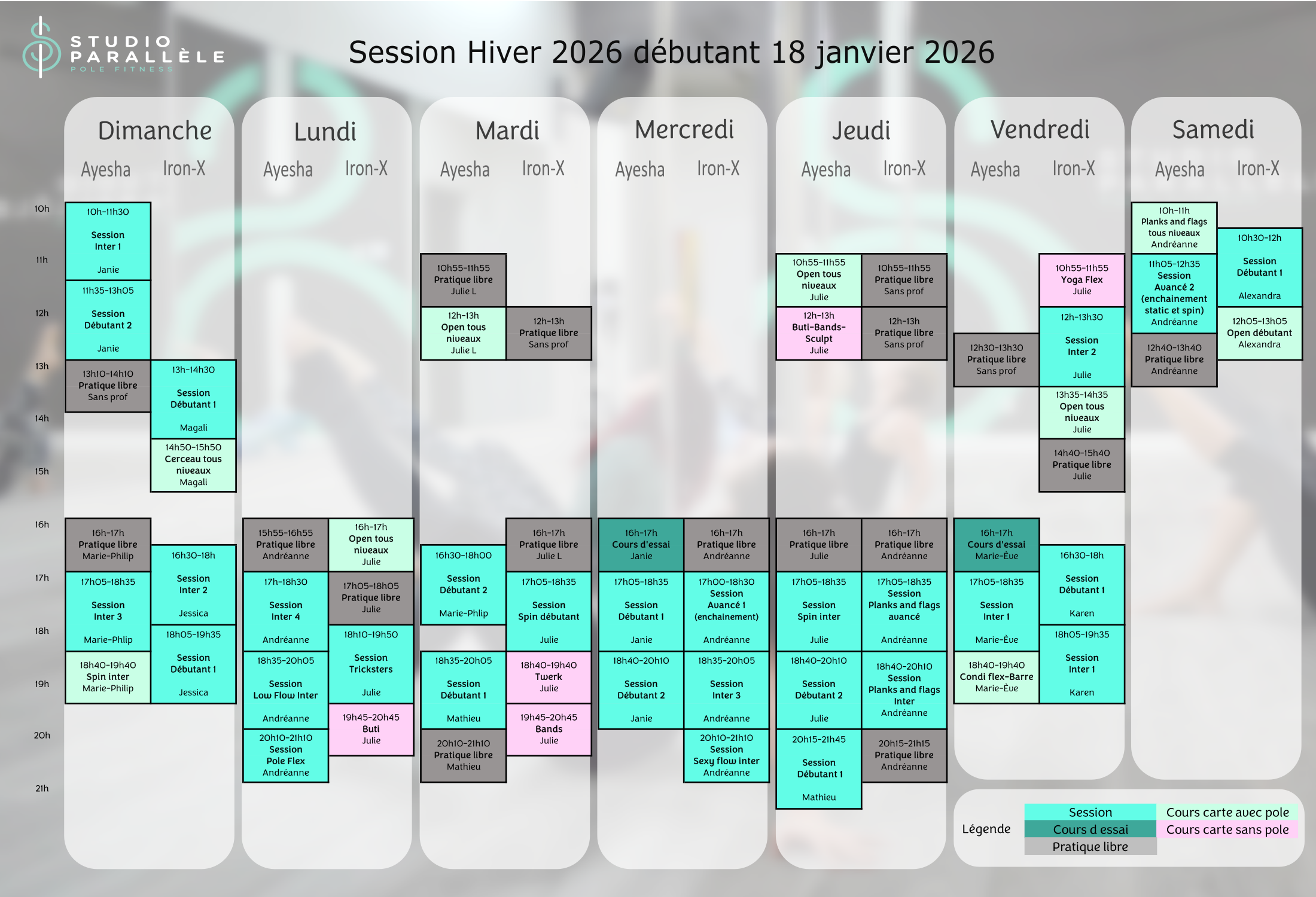 La session débutera le dimanche 18 janvier 2026, d’une durée de 10 semaines. À la même heure/même jour chaque semaine et d’une durée de 90 minutes, à l’exception du pole flex et sexy flow qui seront 60 minutes.