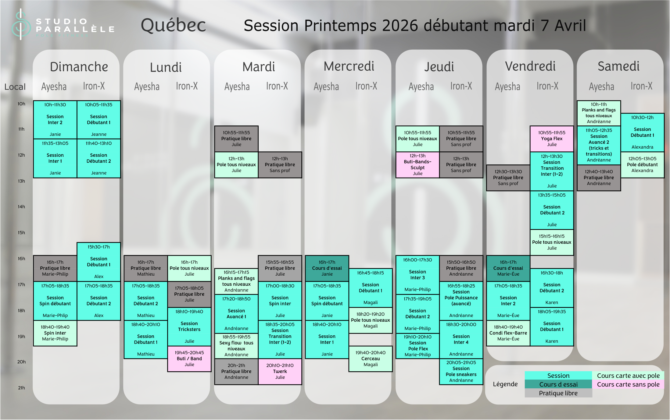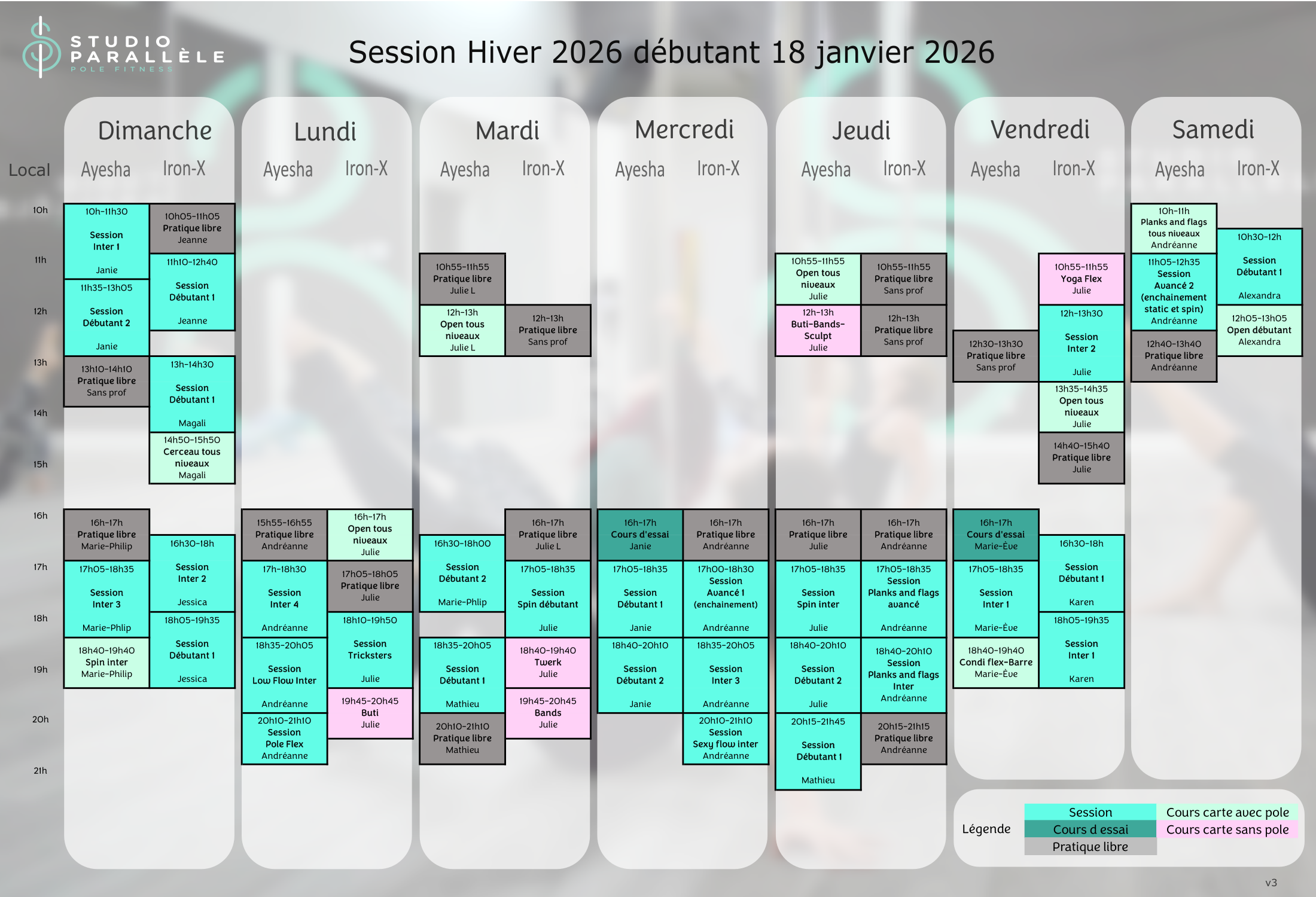 La session débutera le dimanche 18 janvier 2026, d’une durée de 10 semaines. À la même heure/même jour chaque semaine et d’une durée de 90 minutes, à l’exception du pole flex et sexy flow qui seront 60 minutes.